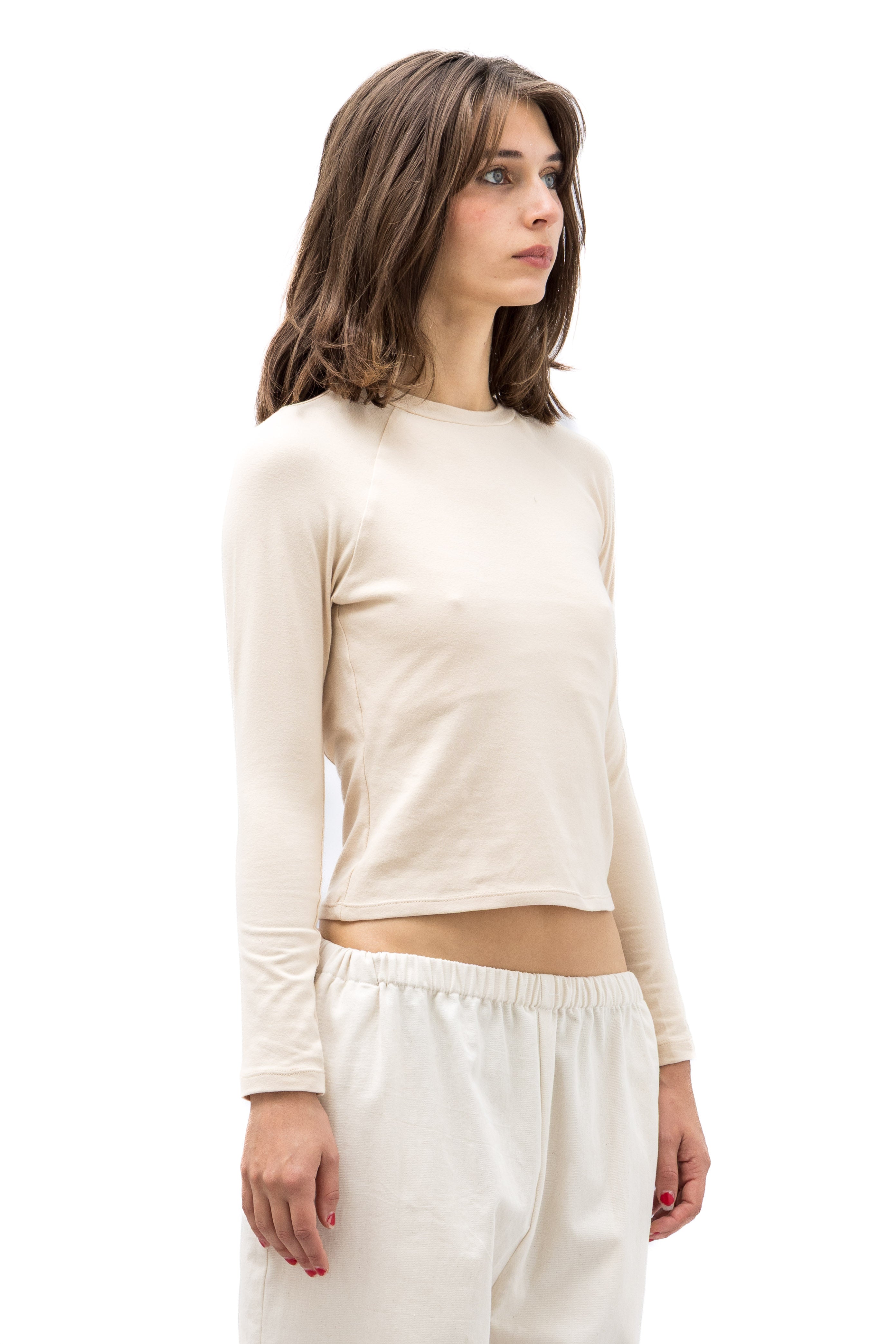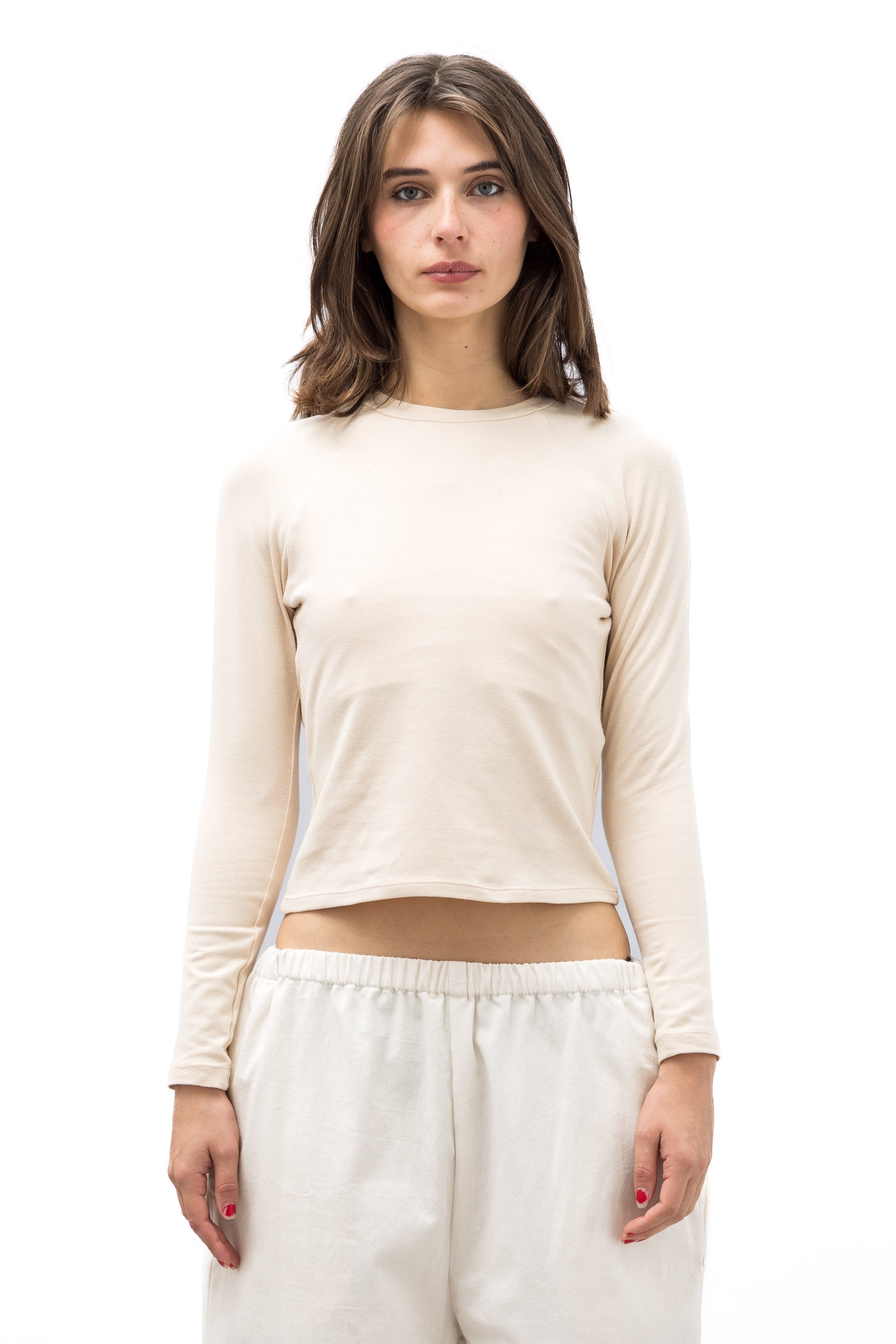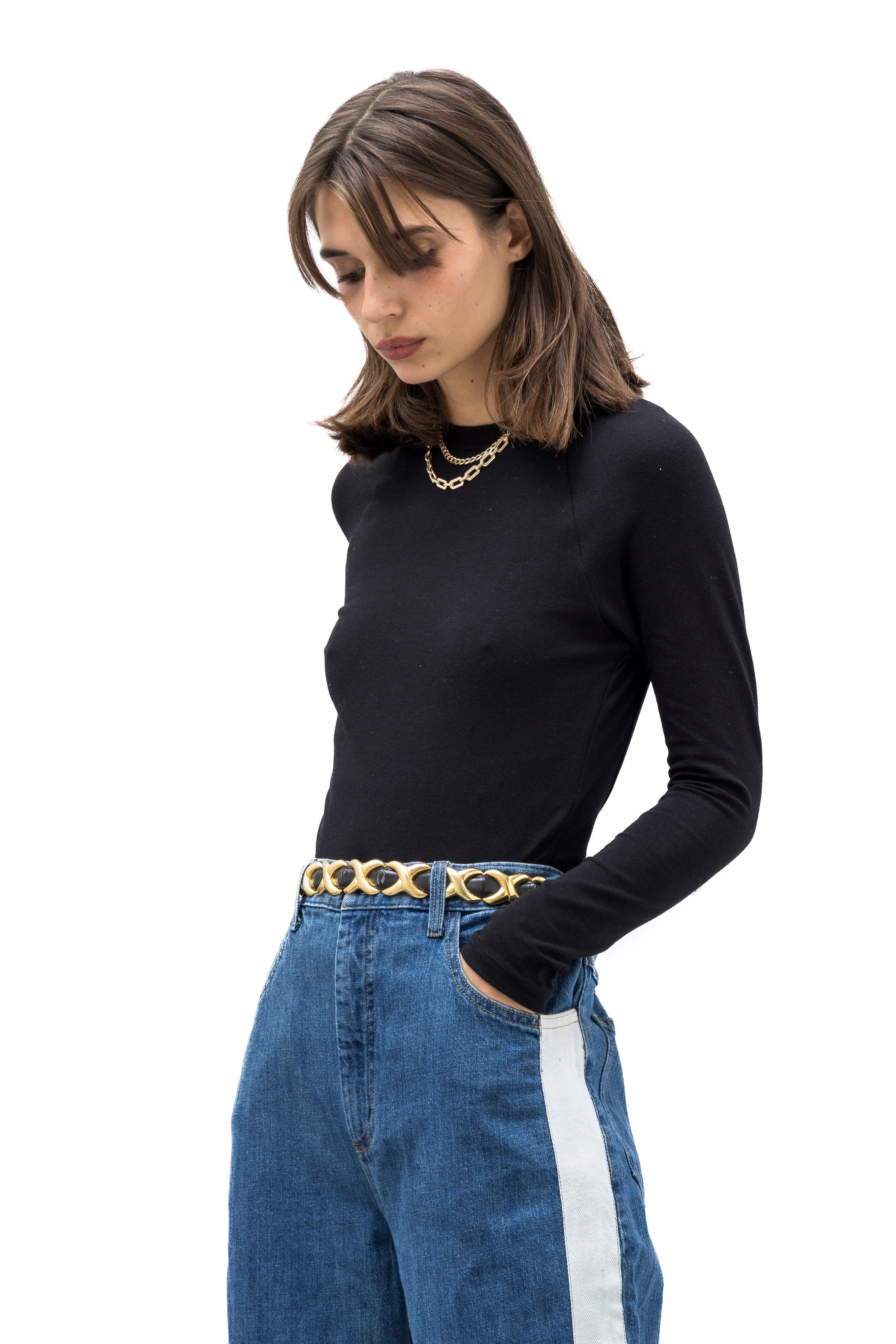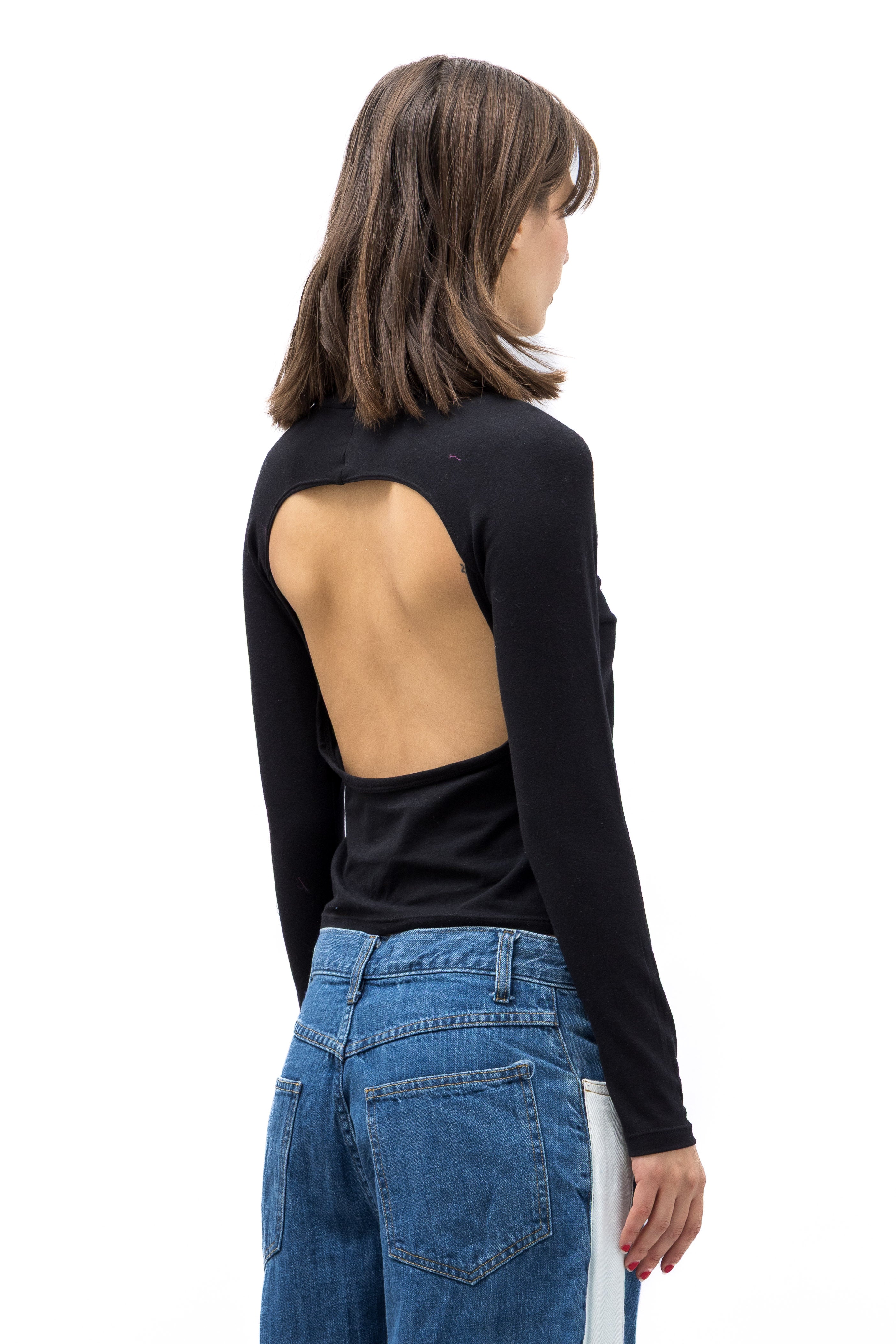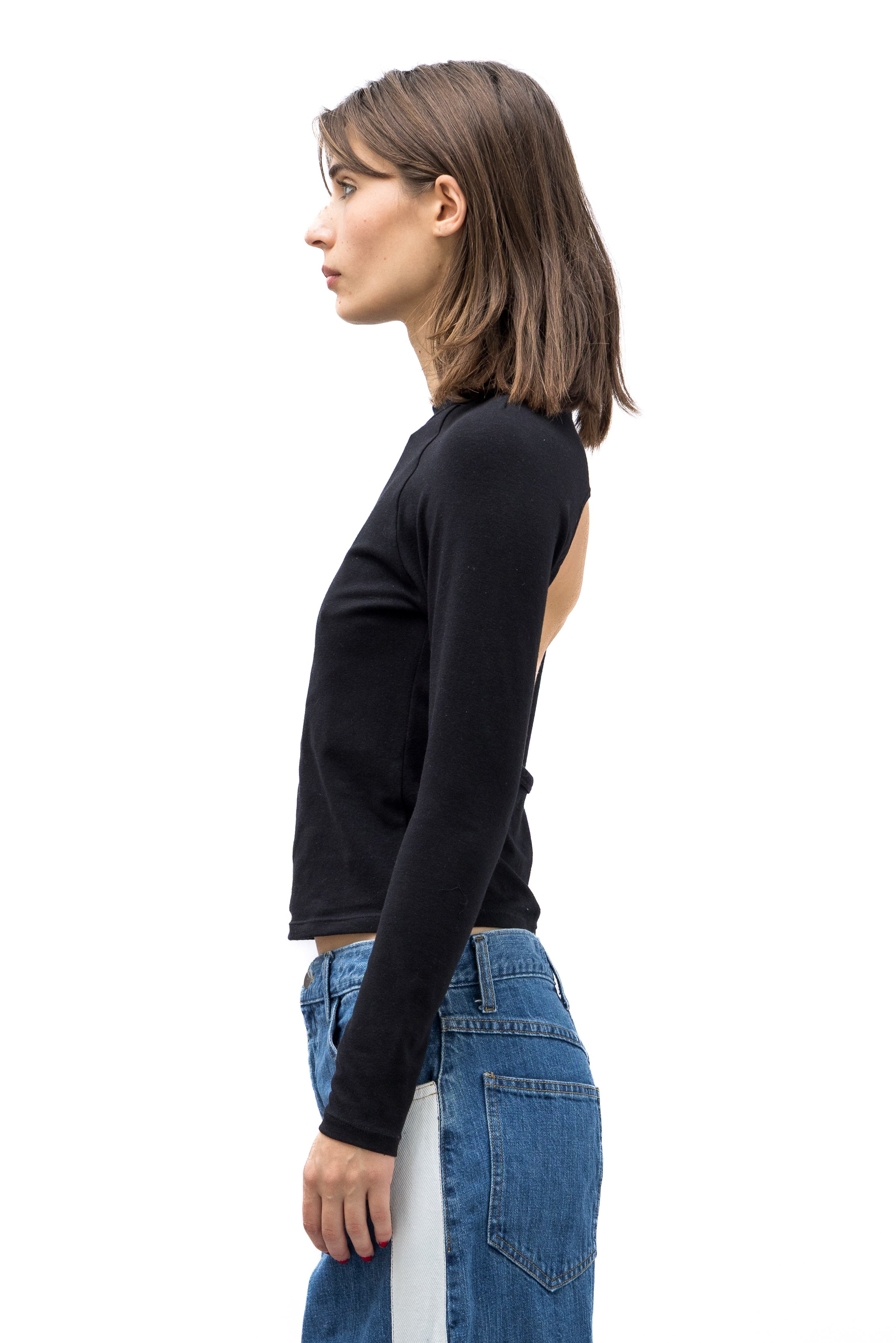 A basic with a little spark. Long sleeve round neckline with a cut-out back for a peek-a-boo.