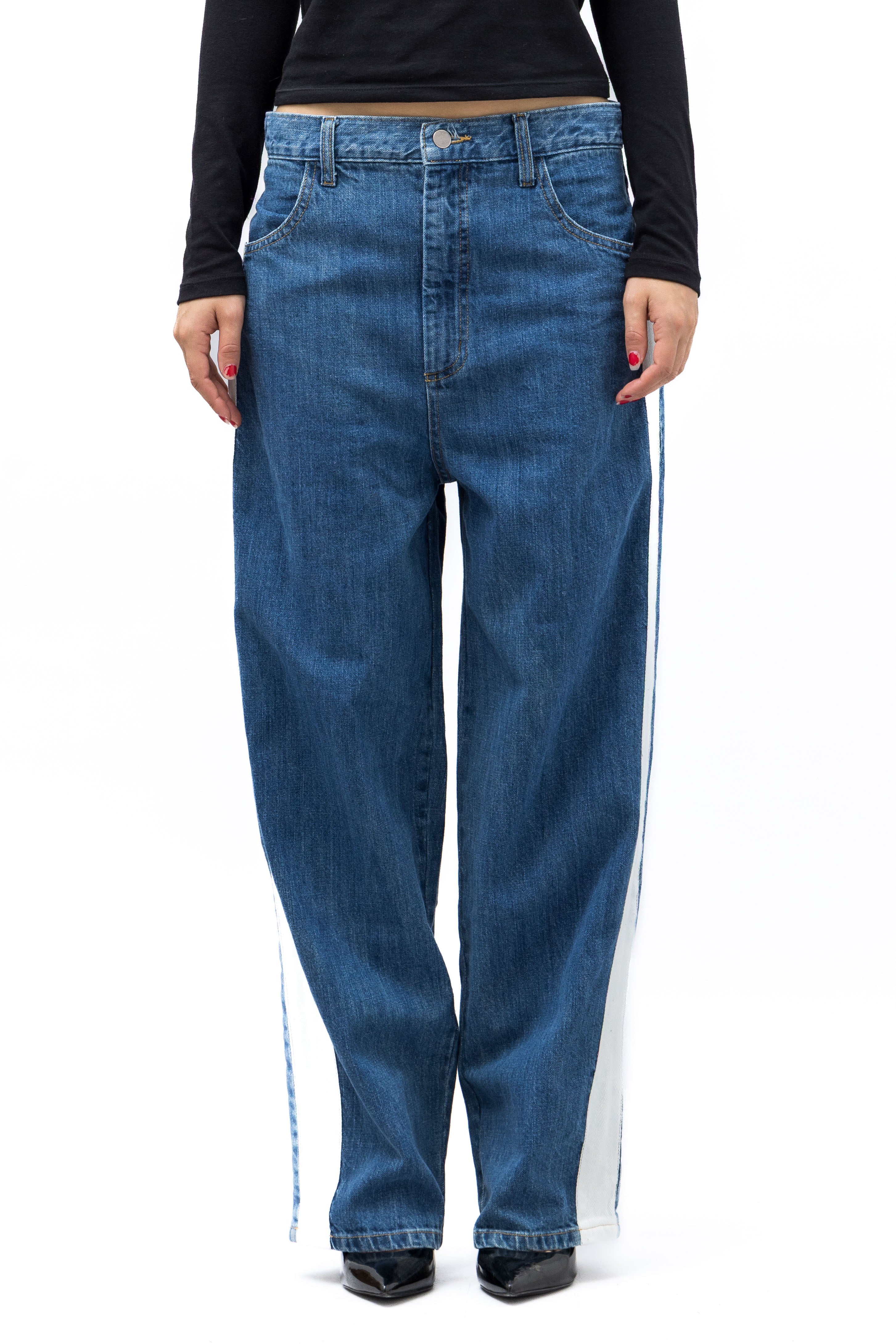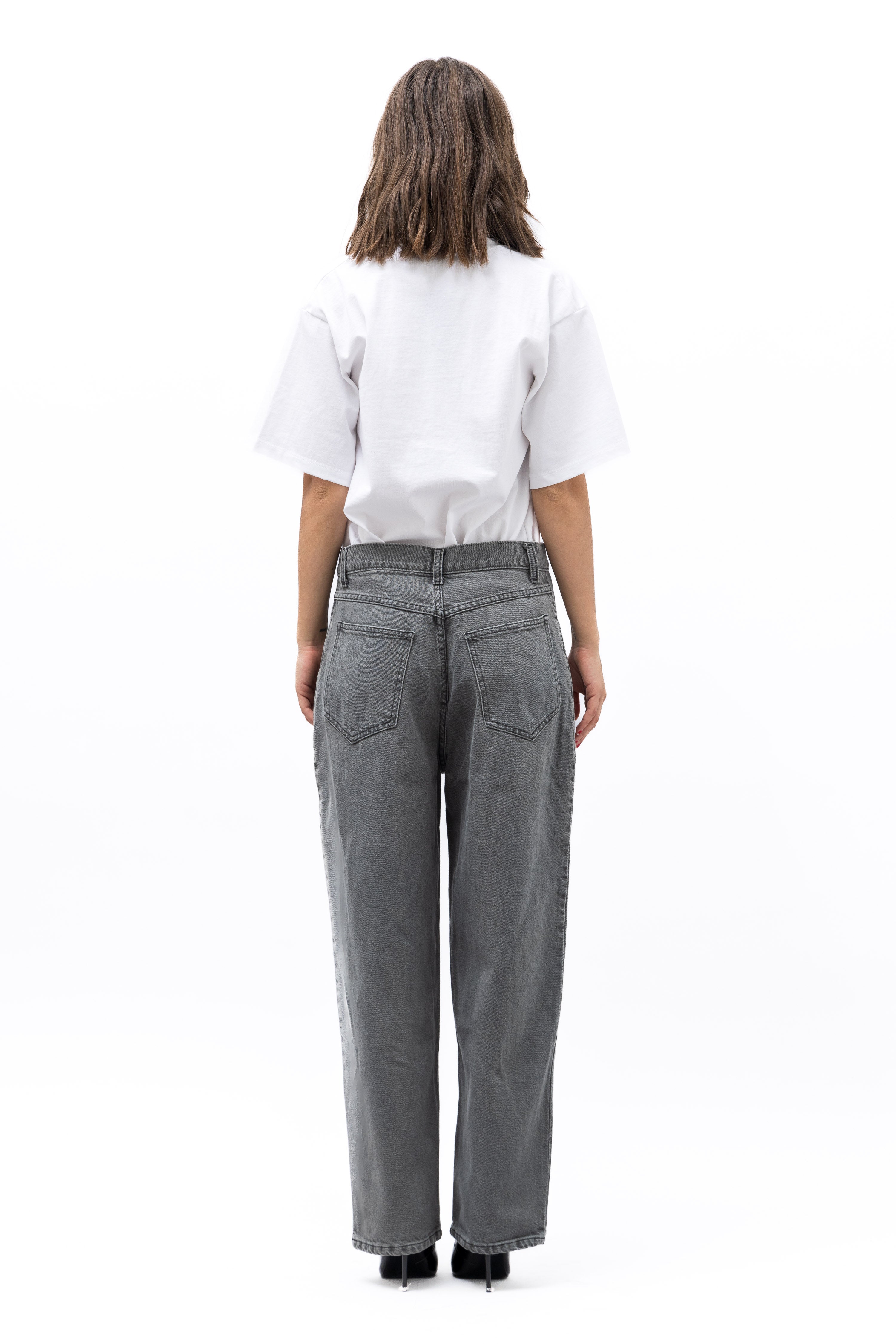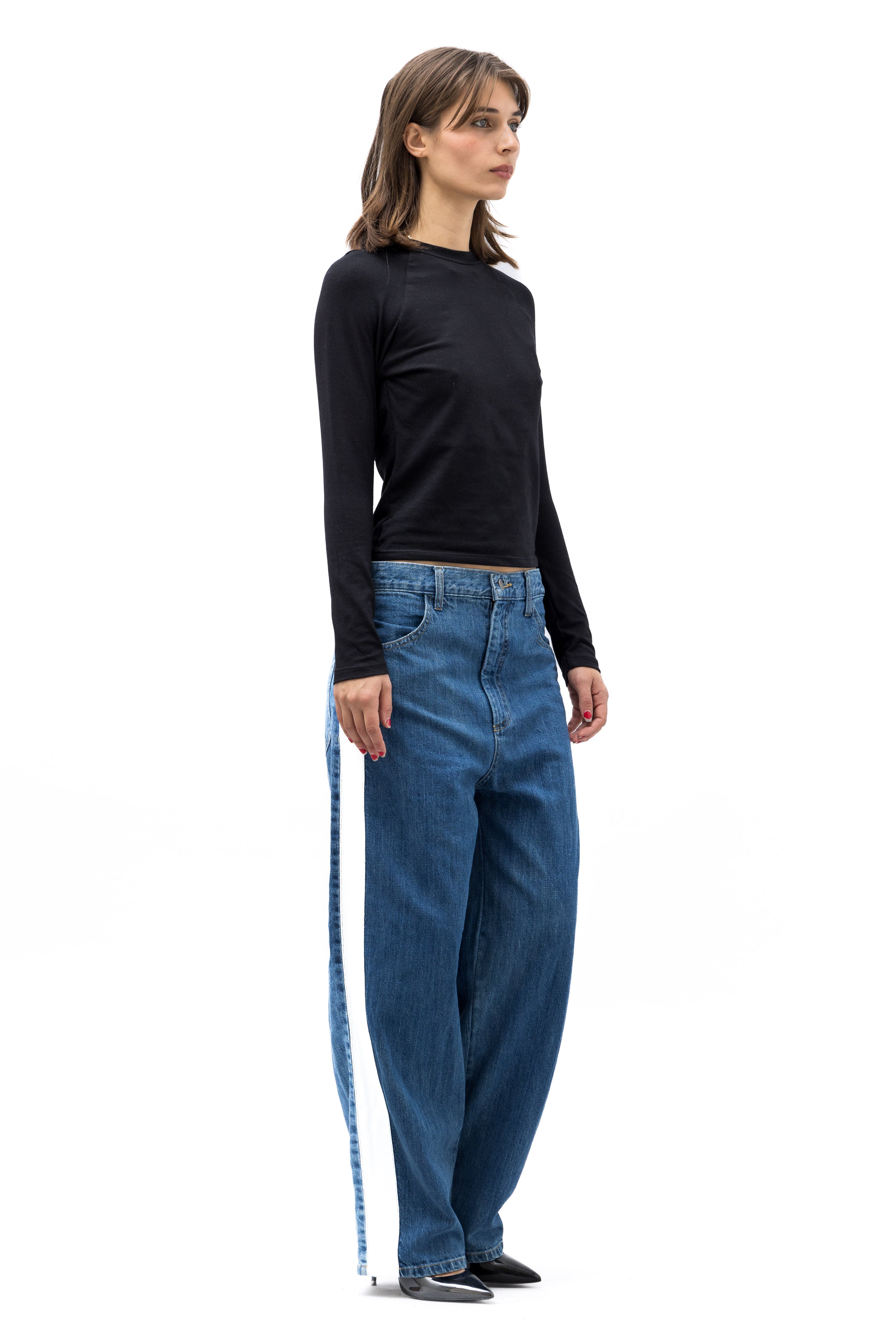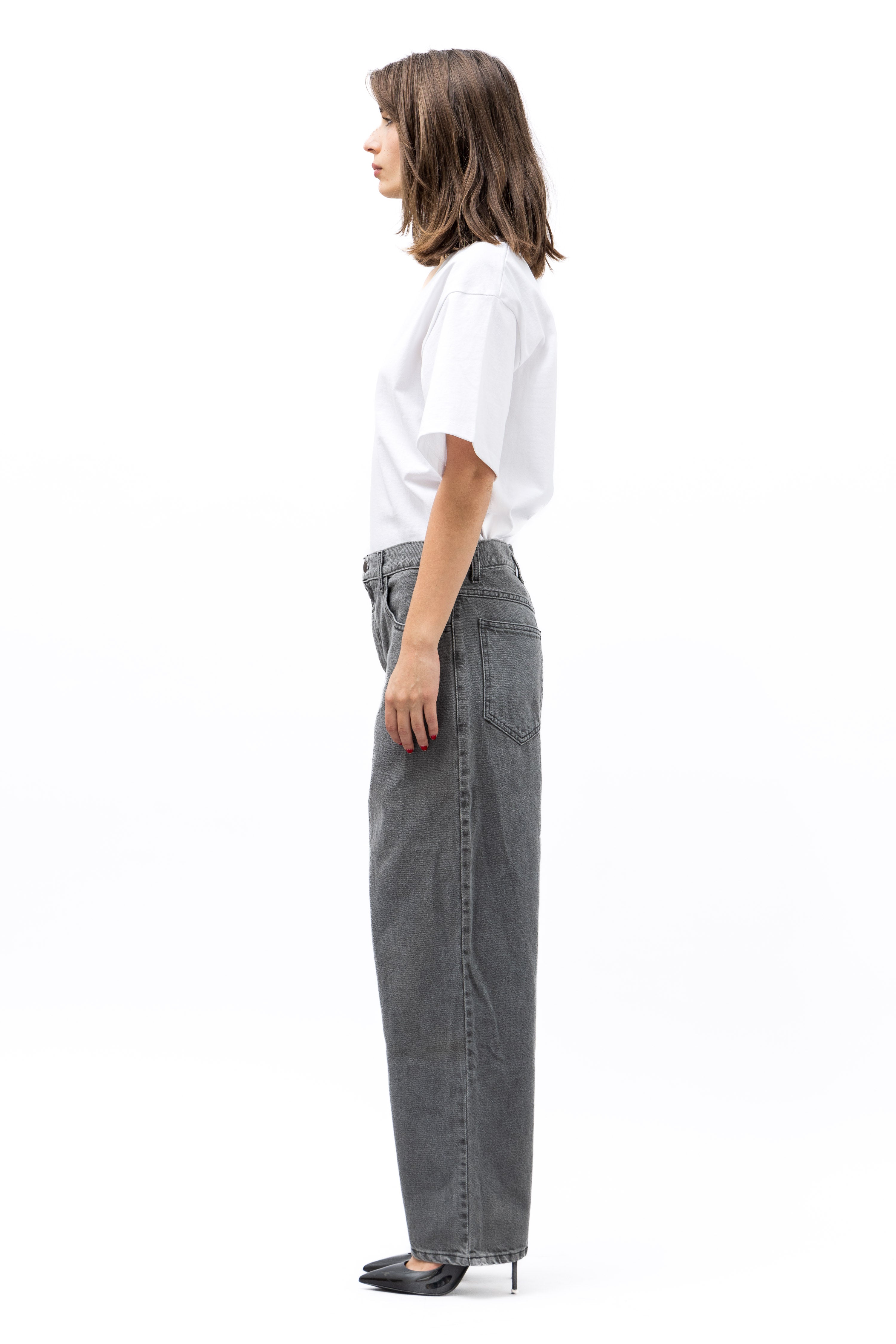 Our first denim fit that we are excited to share. We hope that you love it as much as we do. A hybrid of a high-waist cut with the boyish 80s front rise and slightly tapered ankle pants. A slightly oversize, loungy relax fit, drop crotch that we hope you'll forever treasure in your closet.