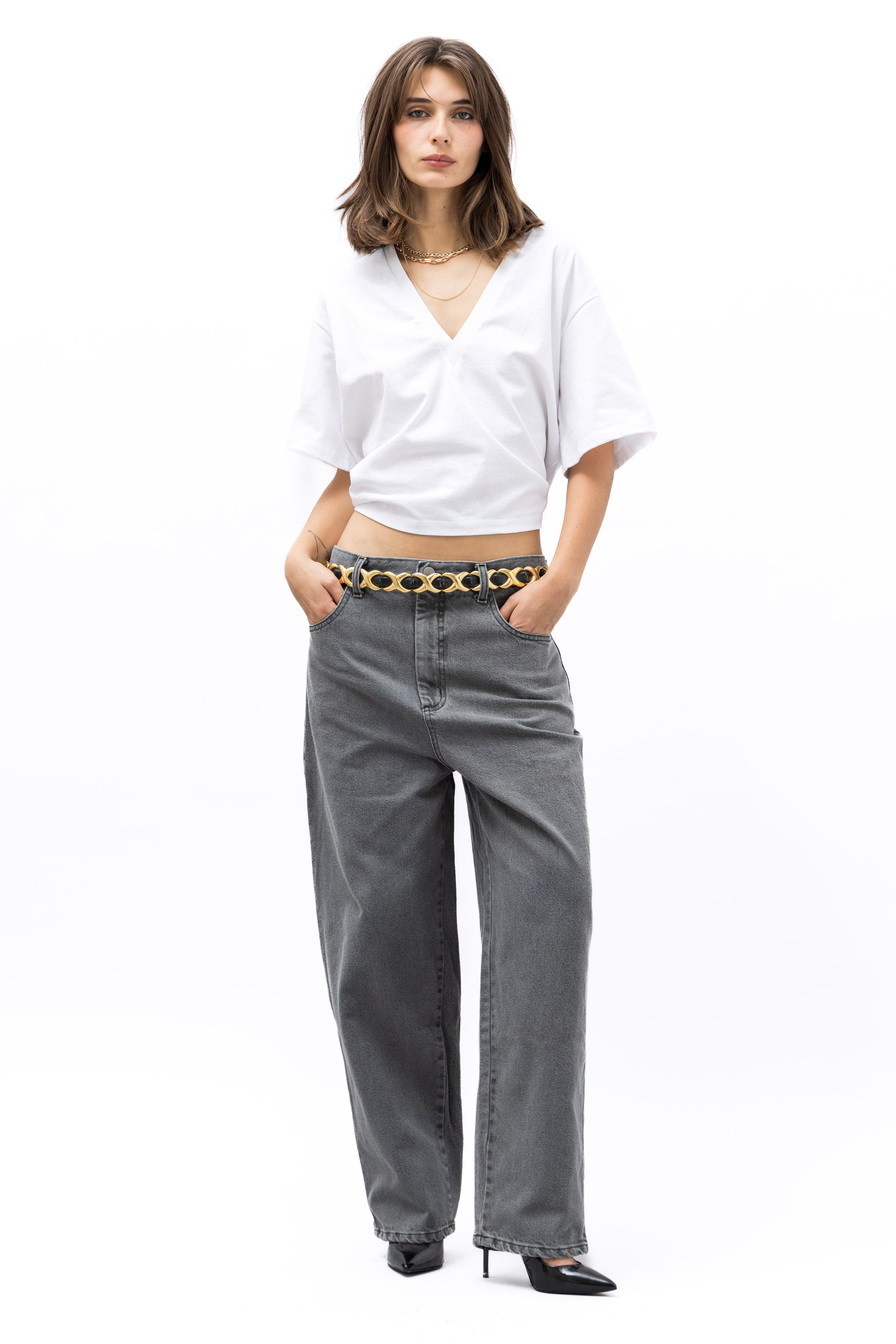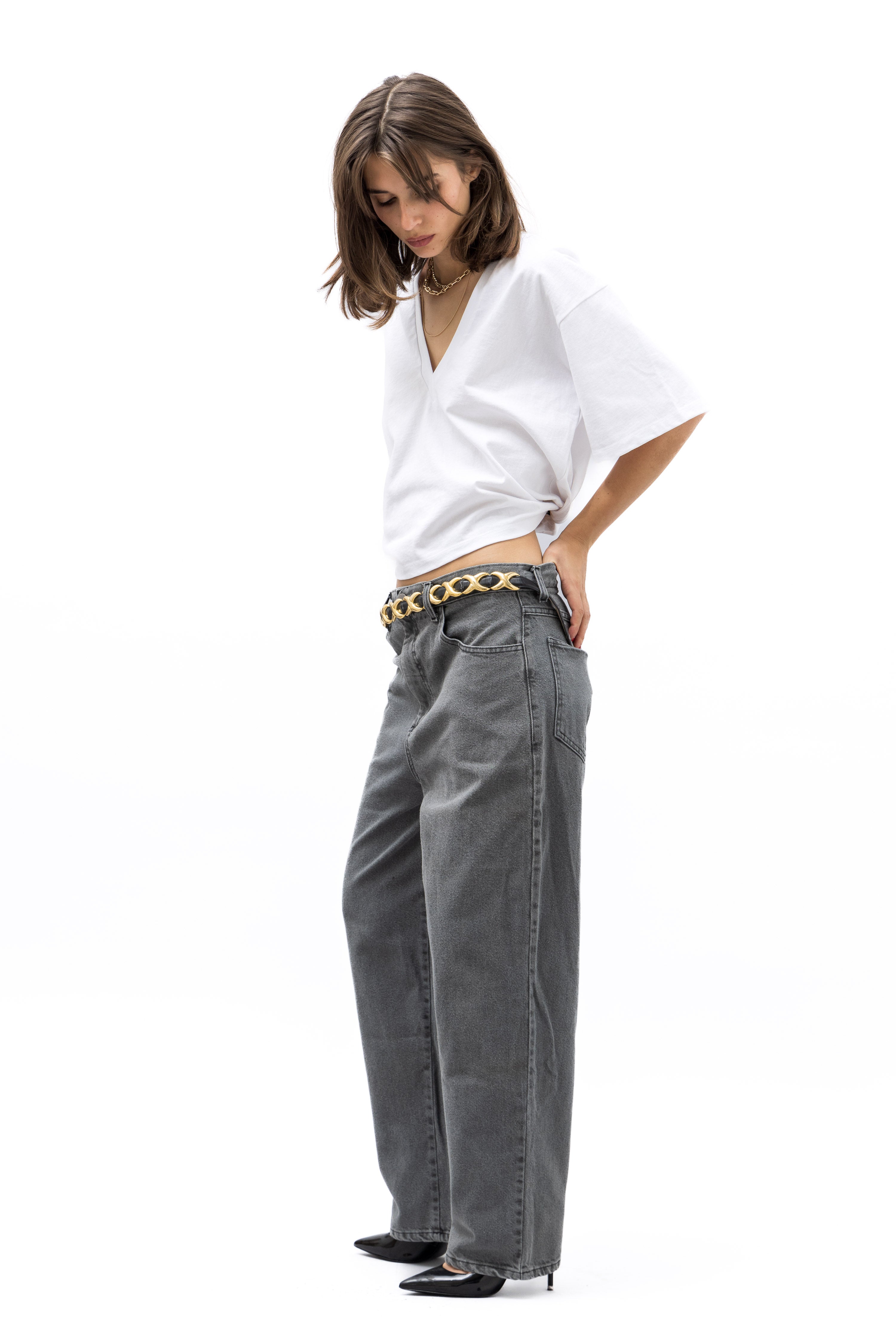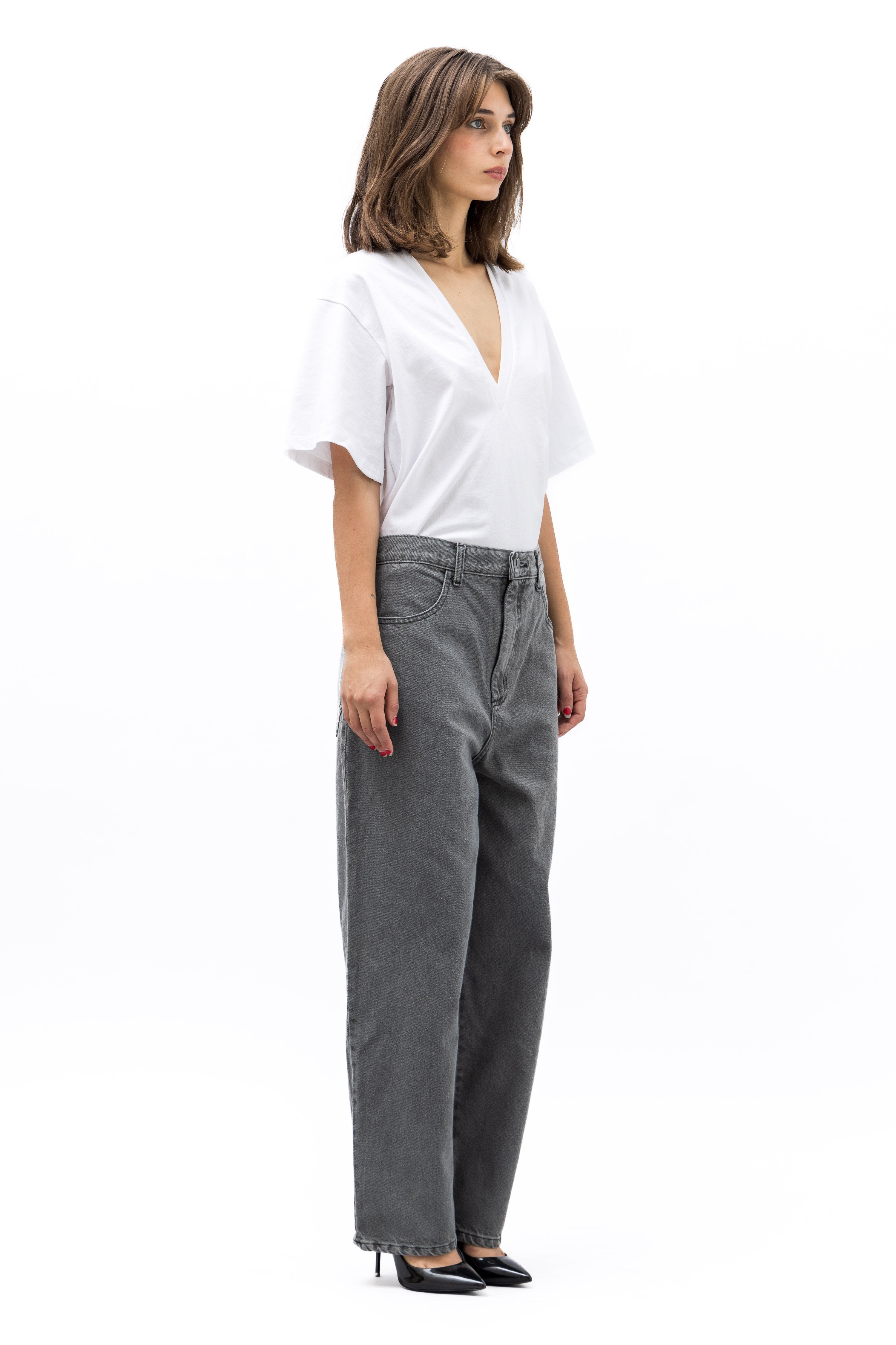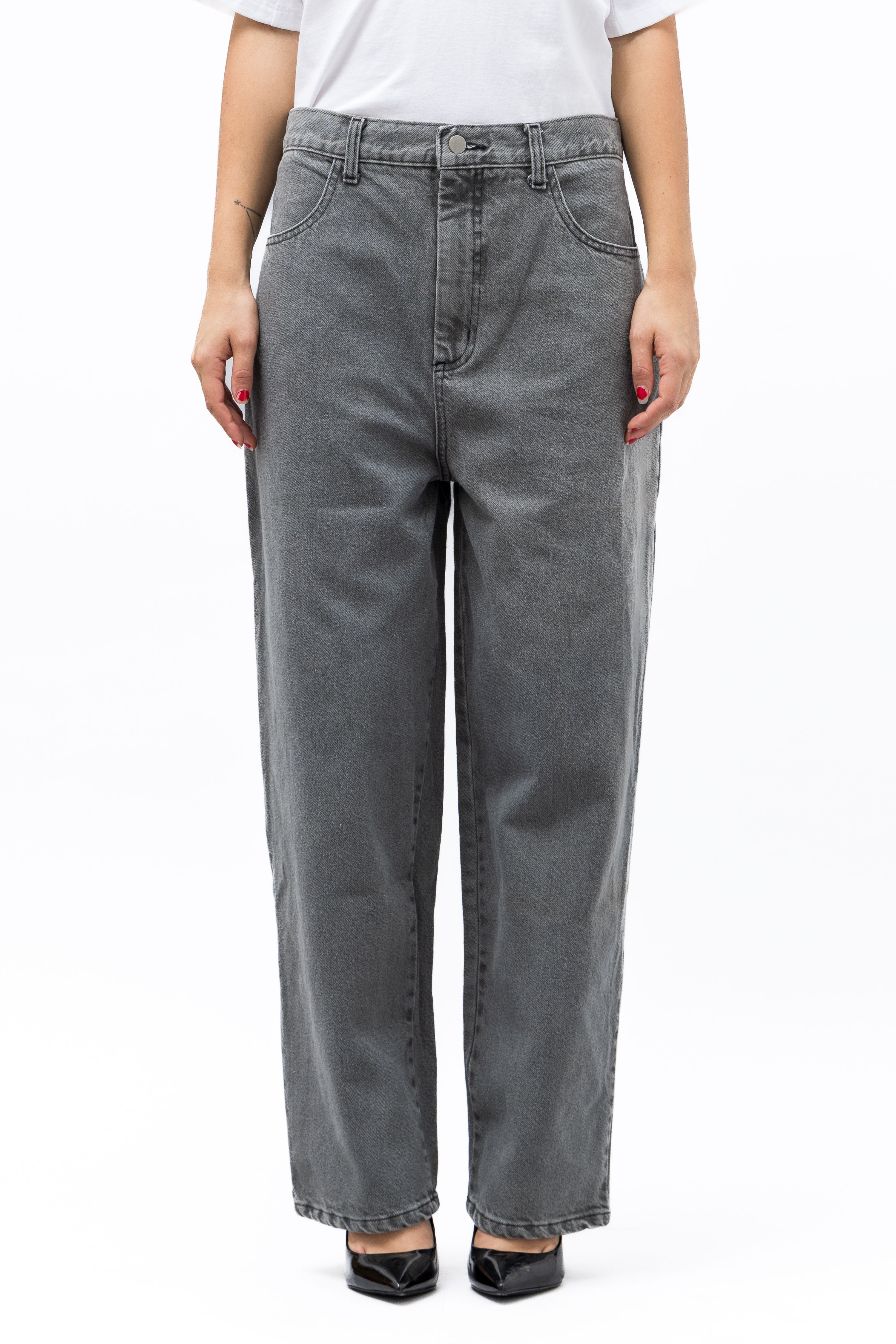 Our first denim fit that we are excited to share. We hope that you love it as much as we do. A hybrid of a high-waist cut with the boyish 80s front rise and slightly tapered ankle pants. A slightly oversize, loungy relax fit, drop crotch that we hope you'll forever treasure in your closet.
