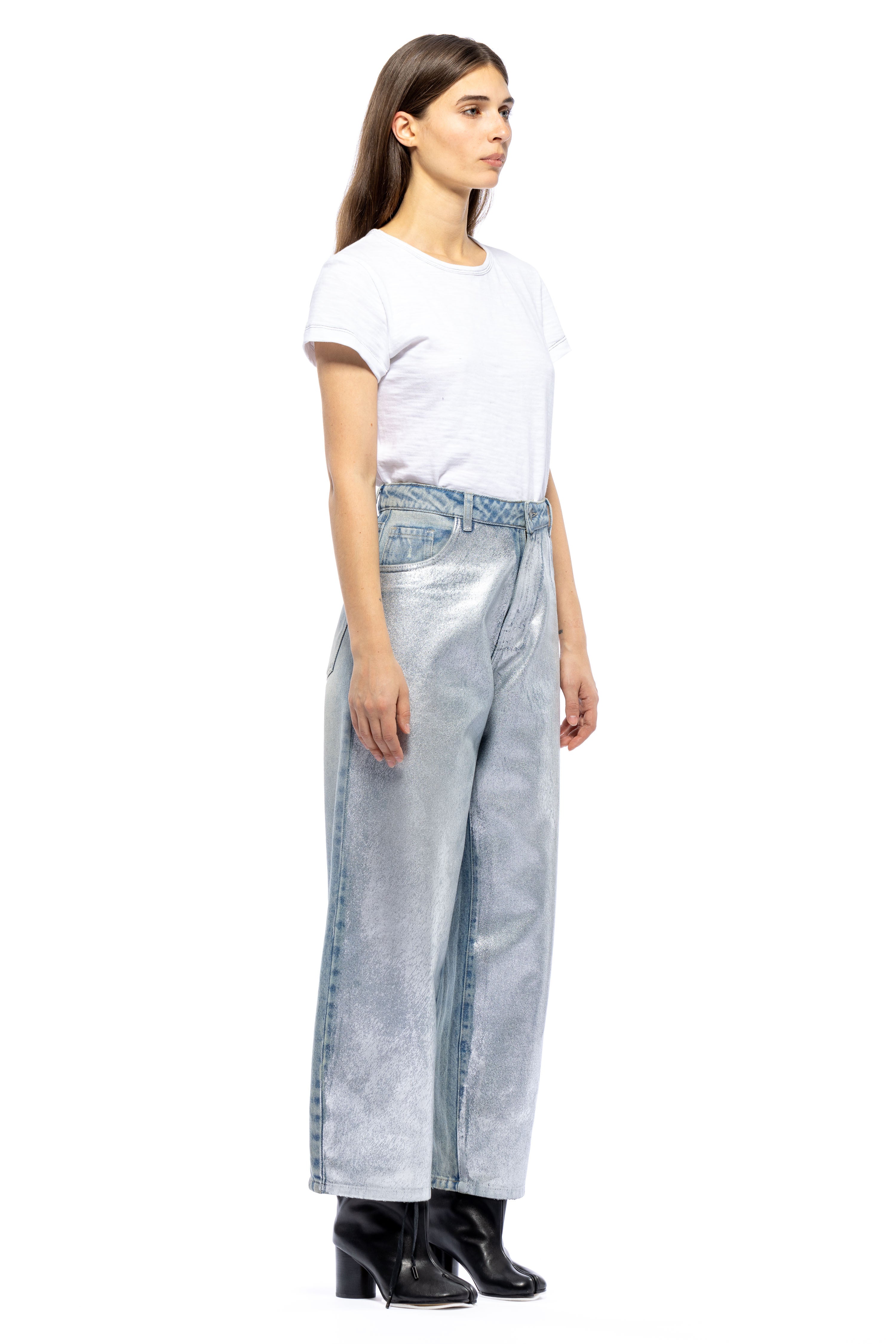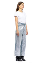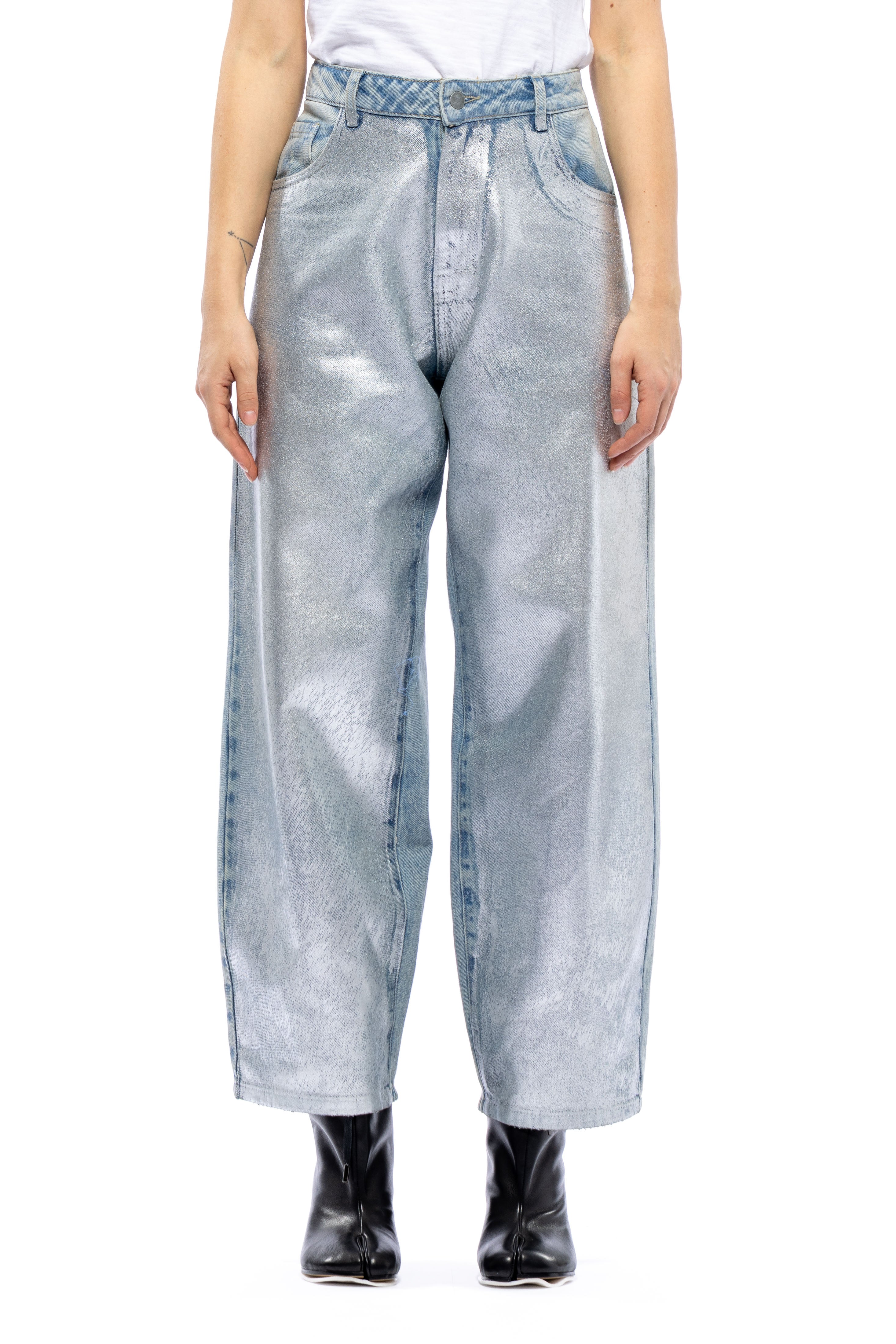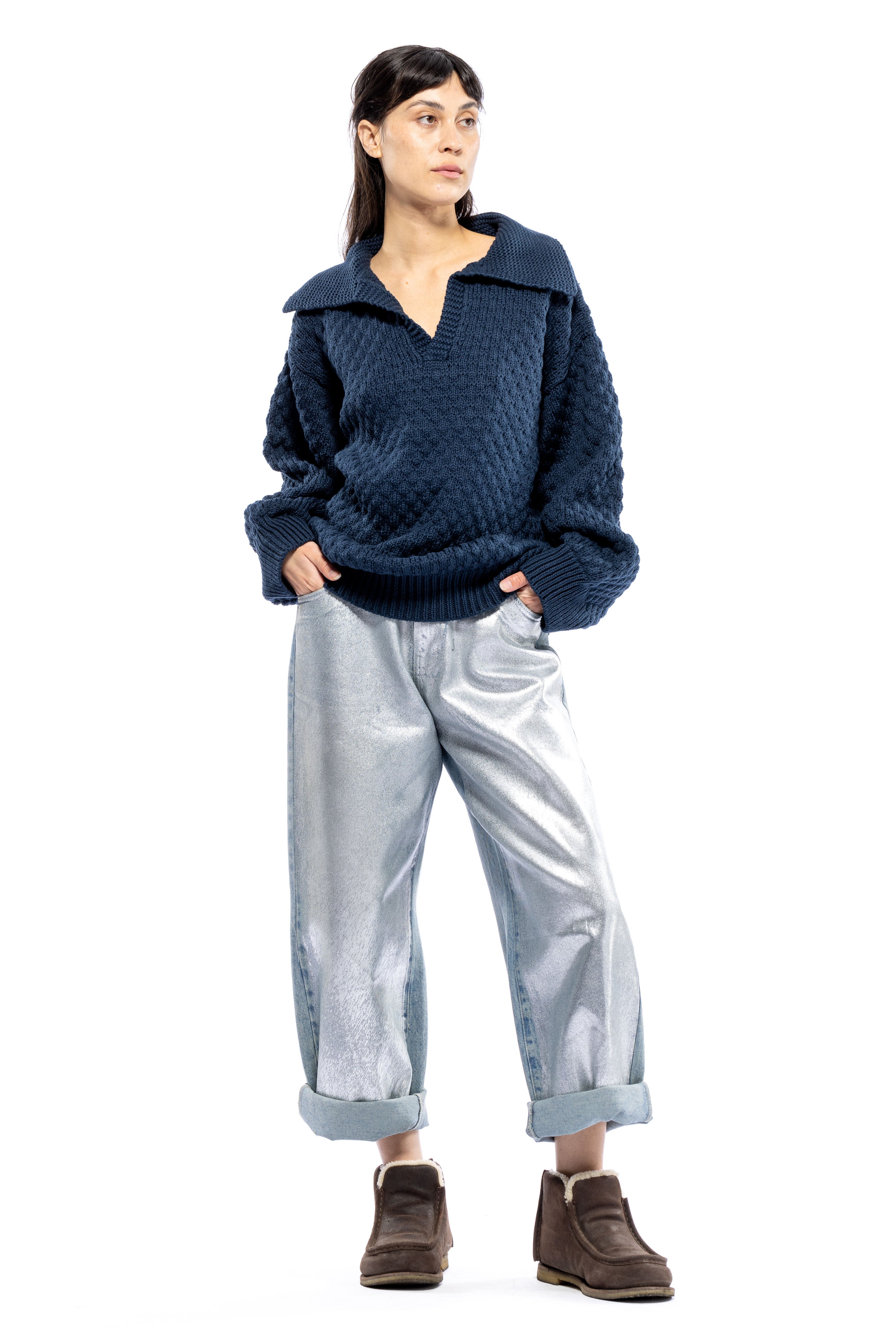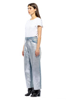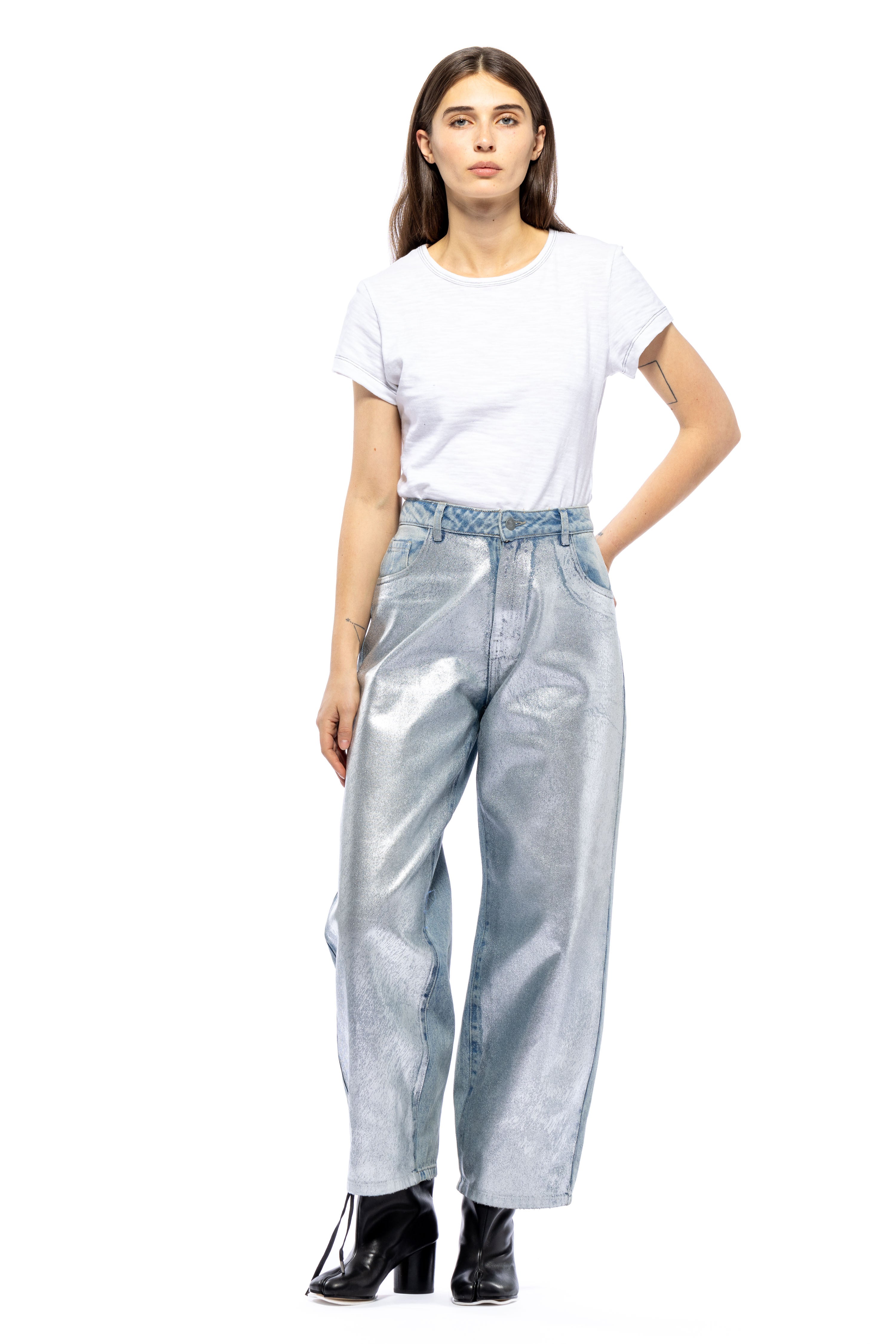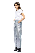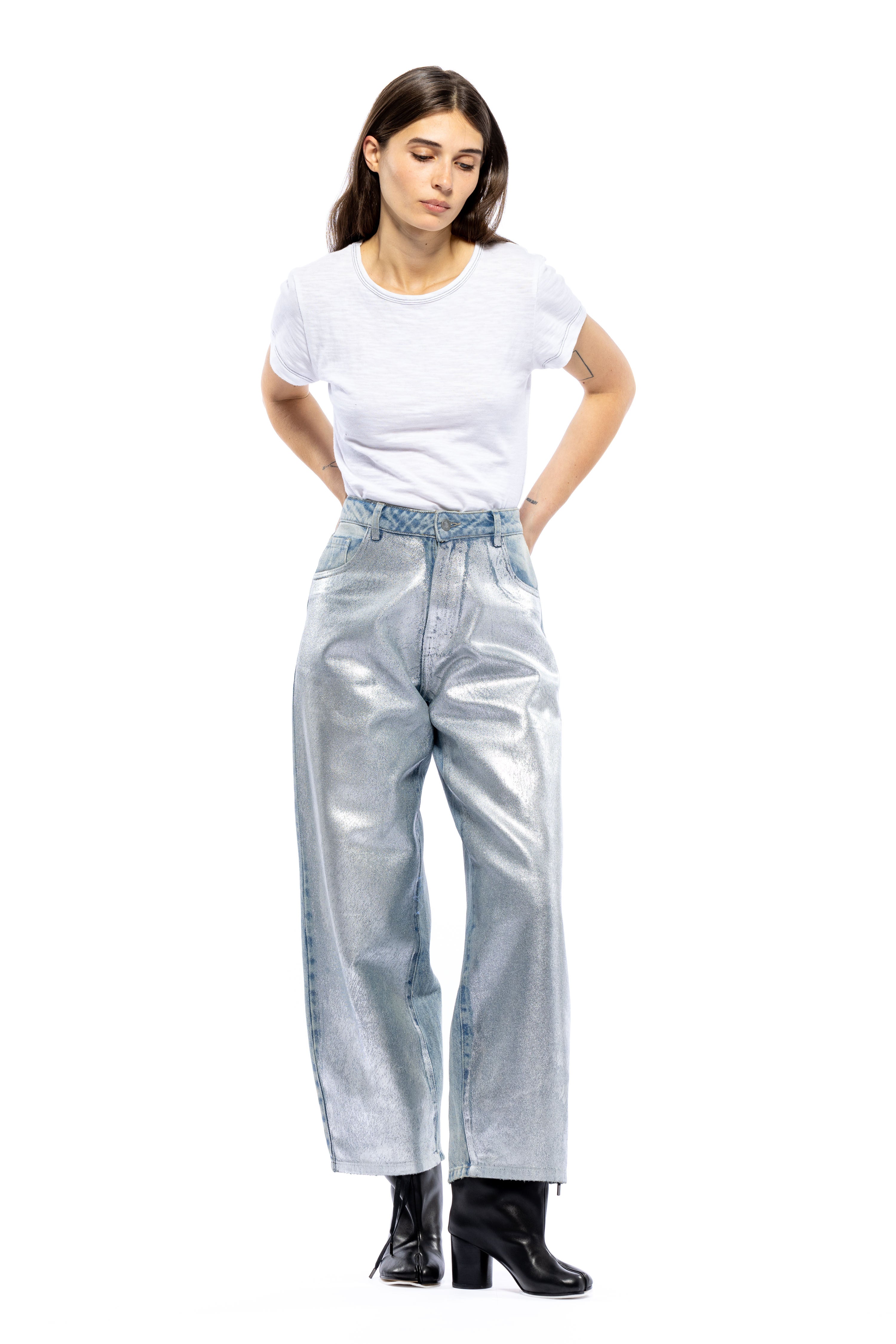 Our first hand-crafted double foiled barrel leg pants, made in Peru, foiled in Los Angeles. Stand out with our Mio denim, a playful style to dress up a casual occasion. Each denim is hand-foiled one leg at a time.